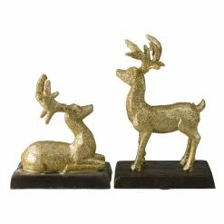 Glittered gold reindeer figurines set a festive scene on a mantel or shelf with the Northlight Gold Glittered Reindeer Christmas Stocking Holder – Set of 2. Crafted of durable polyresin, the stocking holders feature brown-finished weighted bases for superior stability, plus attached hooks to easily hold stockings. One reindeer figurine is standing, the other is lying down.
