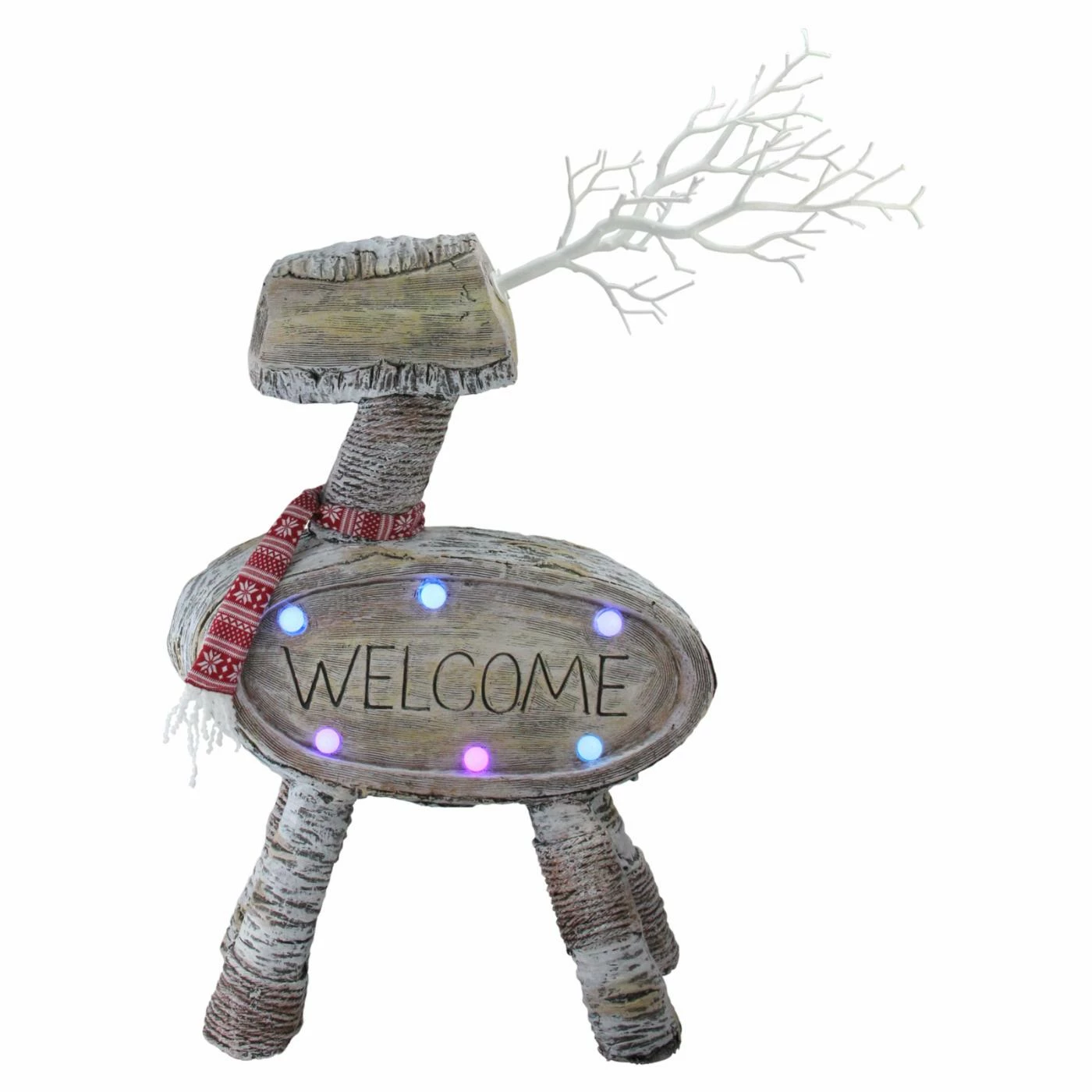 Welcome family and friends to your home with the Northlight 23.5 in. Pre Lit Welcome Reindeer Decorative Accent. This whimsical reindeer decoration features a rustic fabric, plastic, and wire design and a soothing gray and brown finish. Colored LED lights add a cheery detail.