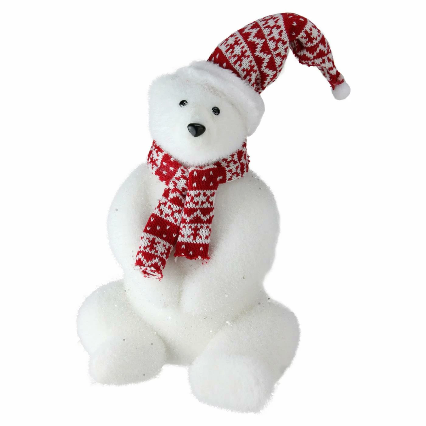 The Northlight Retro Christmas Polar Bear Decoration adds adorable charm to your home with a sweet white polar bear wearing his red and white scarf and hat. This oh-so sweet figure features glitter accents, and bendable wire in his hat offers easy positioning however you please.