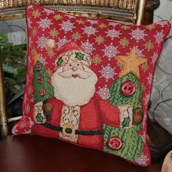 Jolly old St. Nick is just around the sofa corner on the Tache Home Fashion Christmas Tapestry Festive Santa Claus Is Coming to Town Throw Pillow Cushion Cover. Crafted with a cotton/polyester fabric blend, this whimsical throw pillow brings Santa inside with a textural faux needlepoint design in red, green, and gold tones. Choose to include multiple covers, if available. Each one has an invisible zipper closure that makes it easy to add your own insert (inserts not included). Dry clean the cover or machine wash it in warm water and hang or tumble dry on low.