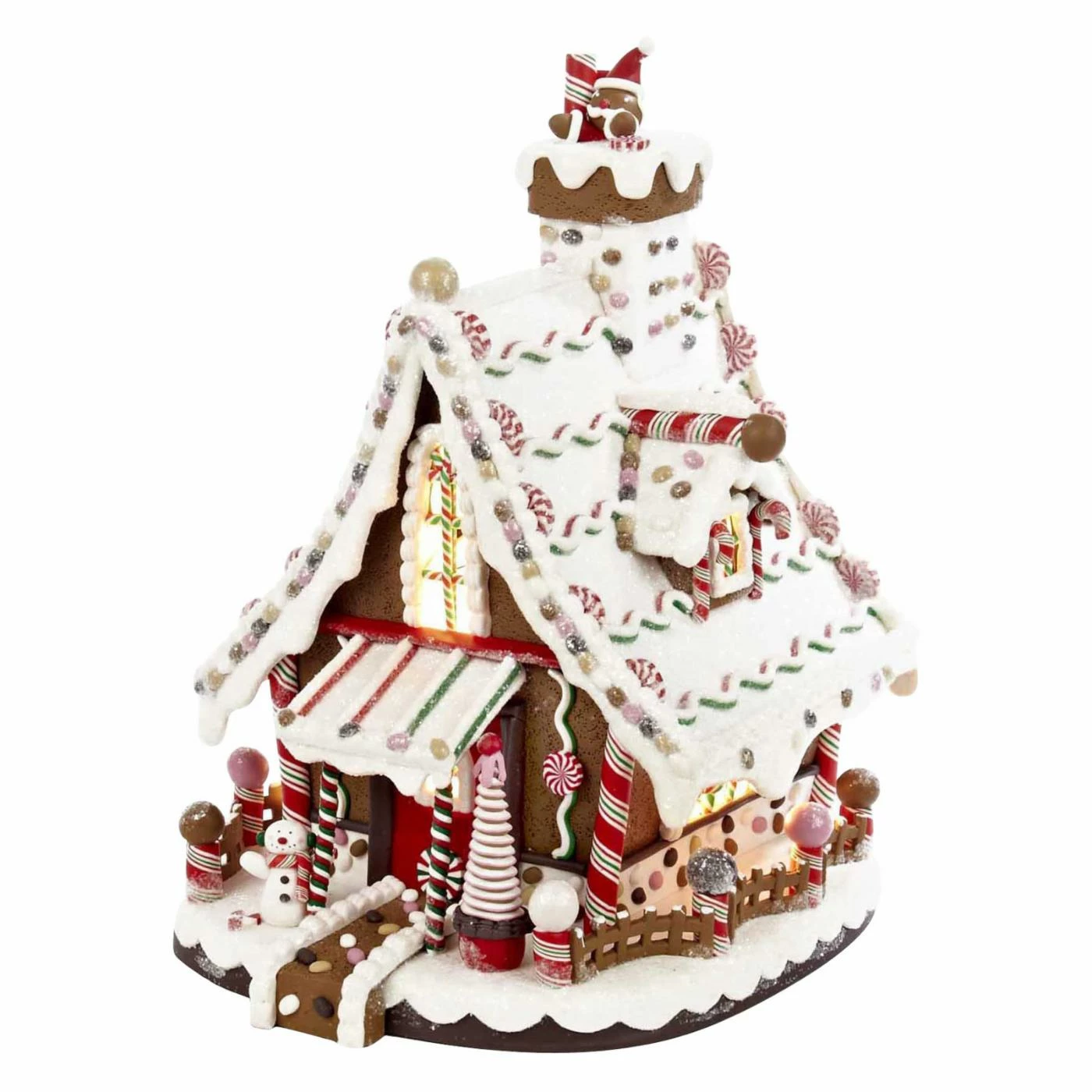 Beautifully designed with intricate detailing, the Kurt Adler 12 in. Lighted Christmas Gingerbread House is a sweet and charming addition to your holiday decor. Resembling a real gingerbread house, this piece looks good enough to eat with its vanilla icing, peppermint, and cookie detailing. This house features a miniature snowman happily standing at the front steps. When switched on, the house is illuminated from within by a bright C7 light.