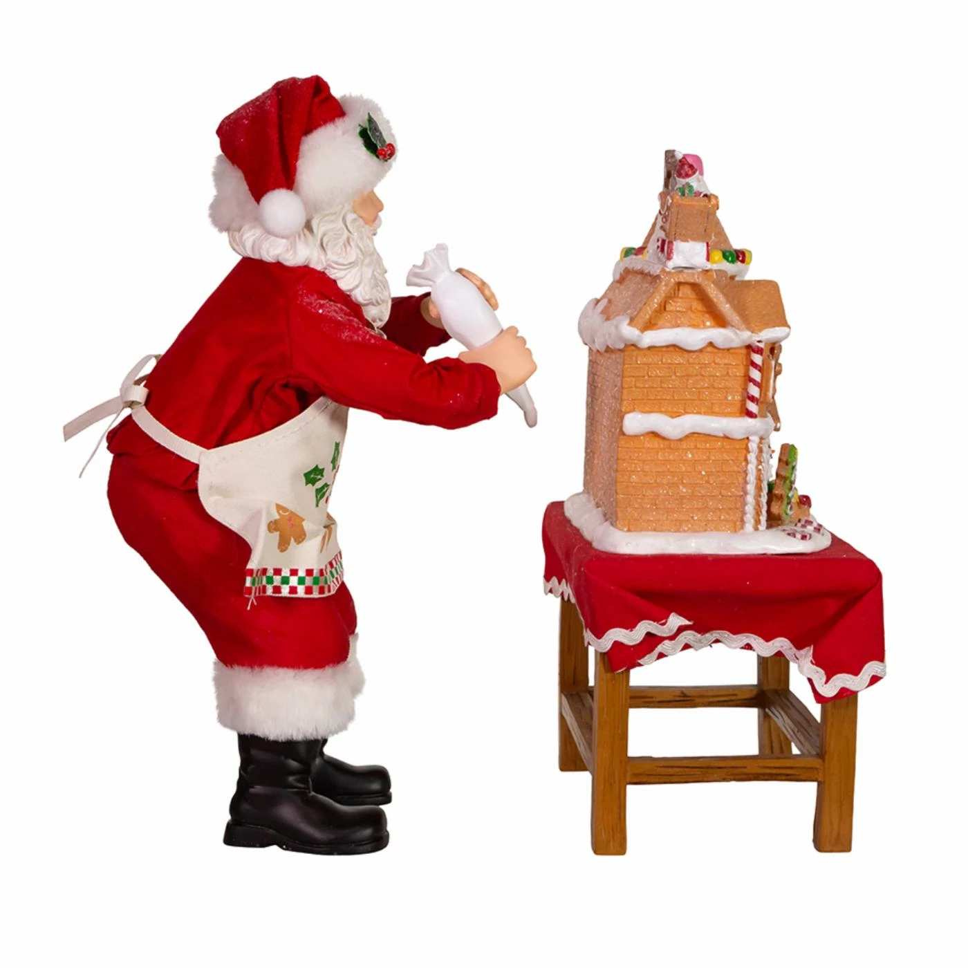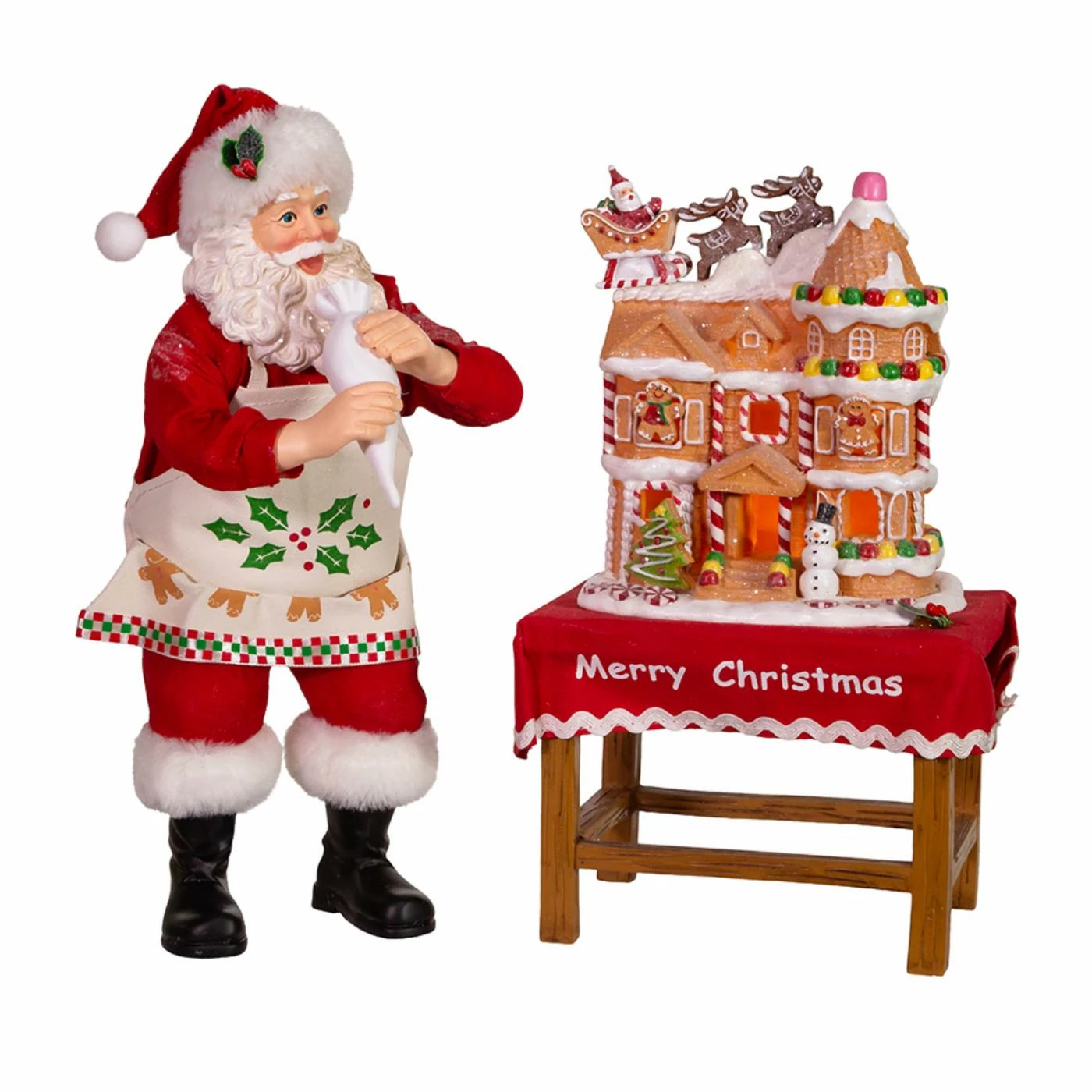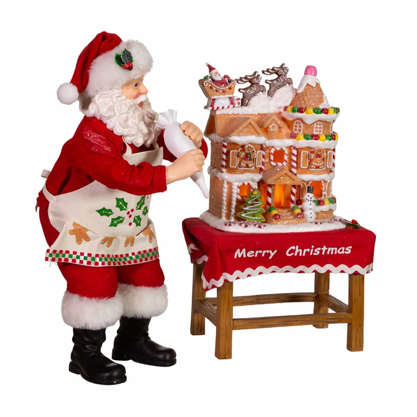 Part of Kurt Adler’s FabrichΓ©β’ collection, this 10.5-Inch Battery-Operated Fabriche Santa Decorating LED Gingerbread House from Kurt Adler is the perfect addition to your holiday dΓ©cor! This set features Santa in his classic red-and-white suit with an apron and holly leave accents. Gingerbread men line the bottom of his apron and in his hand is a piping bag. A decorated elaborate gingerbread house sits on a table lined with a red table cloth with the words “Merry Christmas”.
