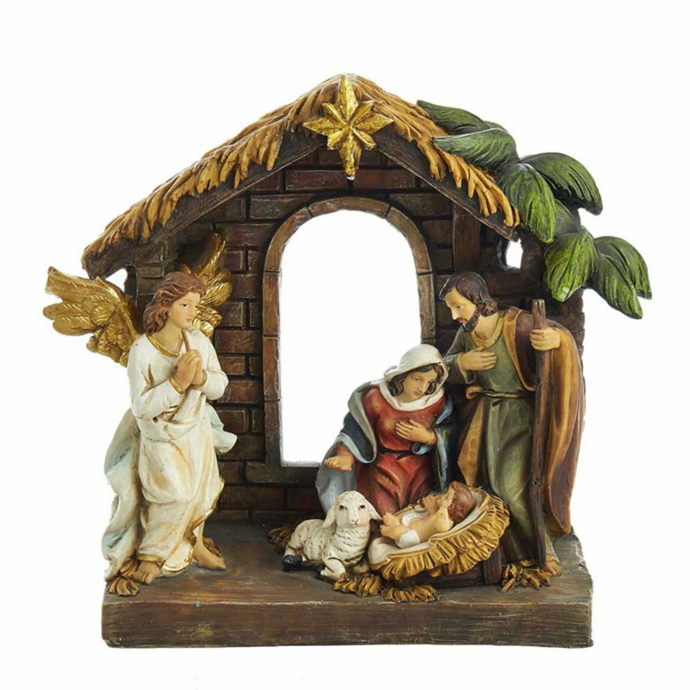 Mary, Joseph, an angel, and a sheep all gaze adoringly at the Baby Jesus in the elegant design of the Kurt S. Adler 9 in. Painted Holy Family Tablepiece. The table decoration is fashioned out of resin material, giving it lifelike detail and the ability to hold up to wear and tear.