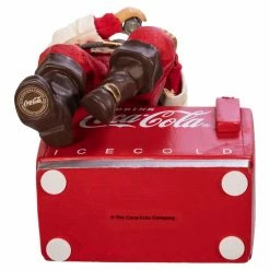 The Kurt Adler 10.5 in. Coca-Cola Santa Sitting on Cooler Table Piece brings together two classics and beverage advertisements of days past. This Santa figurine leans against a Coca-Cola cooler and holds a refreshing bottle in his hand. Add this endearing decoration to your tabletop holiday display.