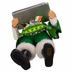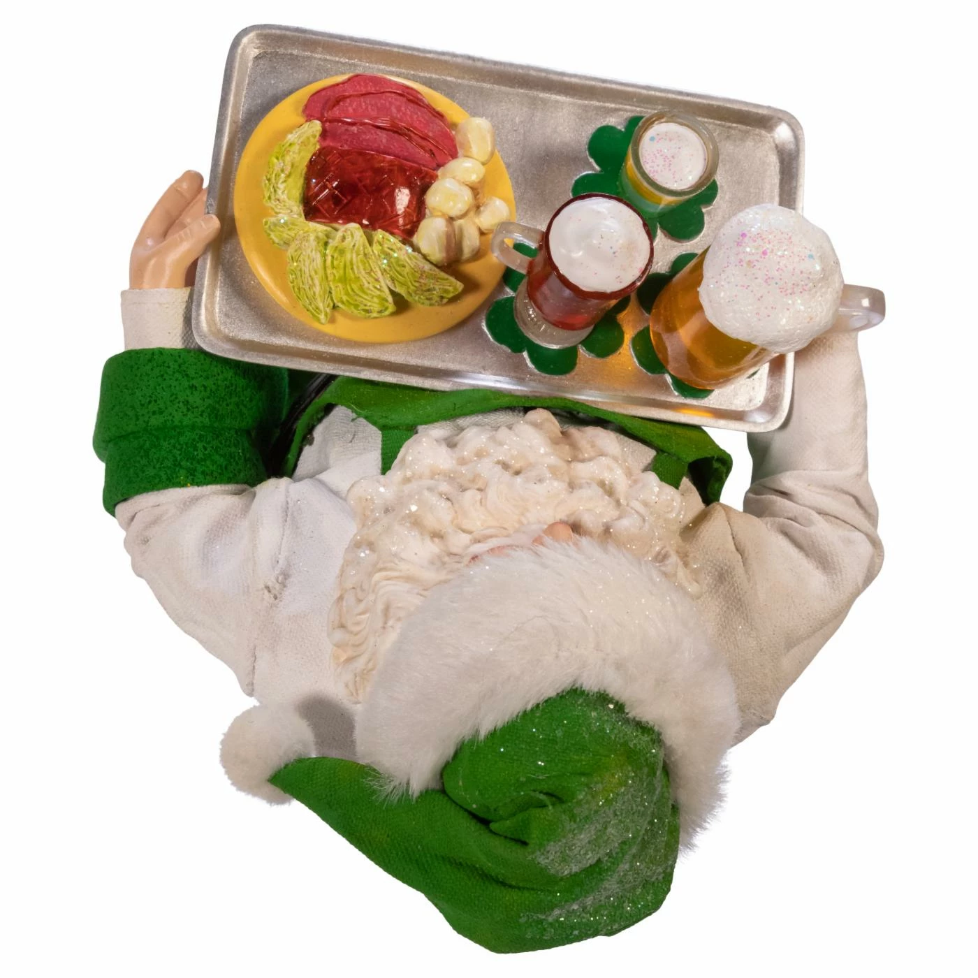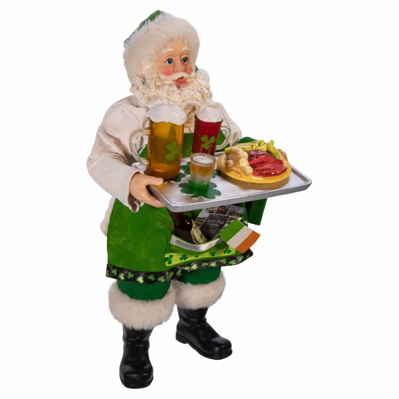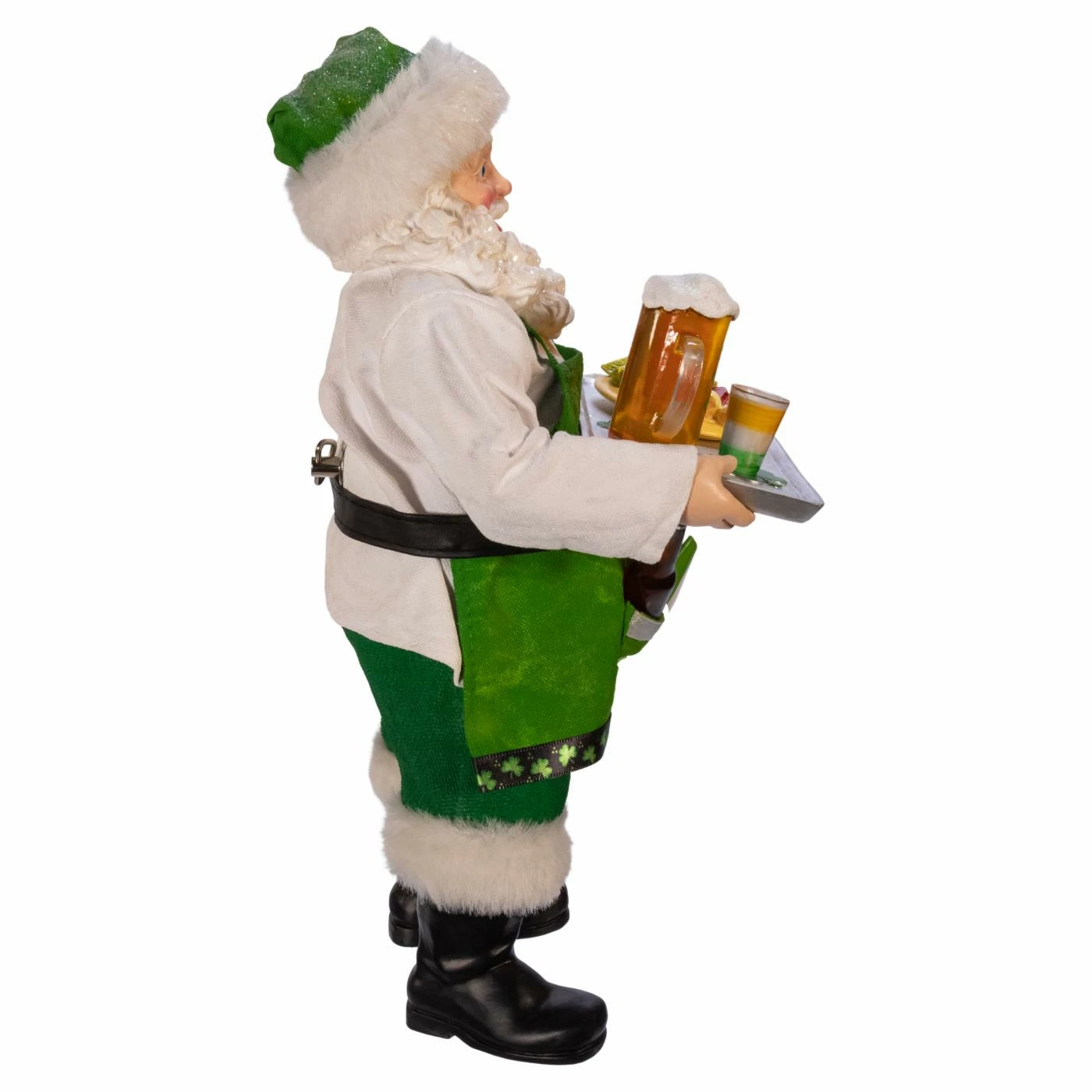 Thereβs nothing quite like an Irish Christmas as the Kurt Adler 10.5 in. Fabriche Musical Irish Chef Santa knows. This Santa is decked out in attire celebrating old Eire, complete with a green hat and shamrock-trimmed apron. On the serving tray and in the apron pocket are a multitude of Irish offerings, including a glass of stout, corned beef, and an Irish flag. The figure is made from PVC and polyester with real fabric clothes. Santa is even designed to play an Irish tune (batteries are not included).