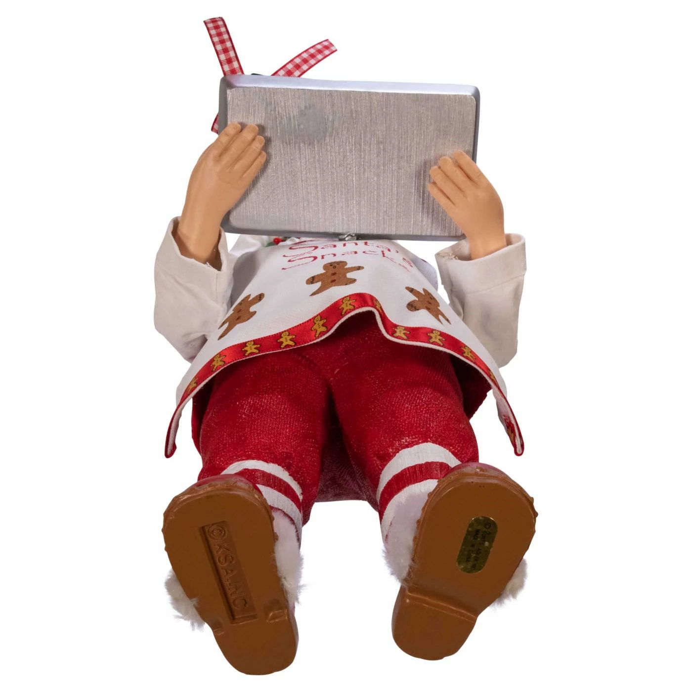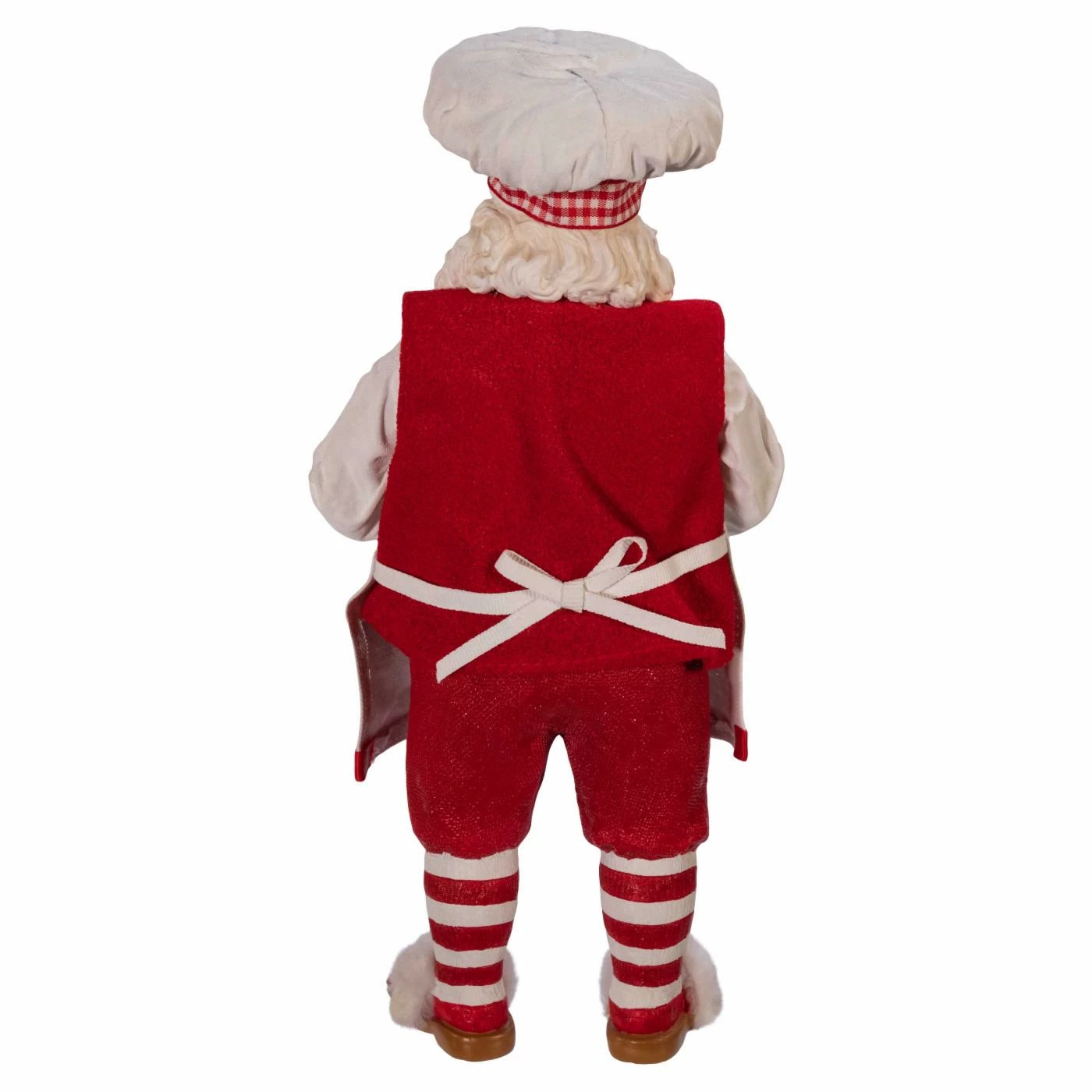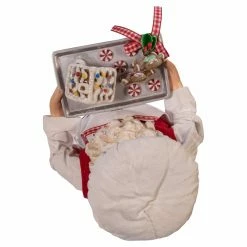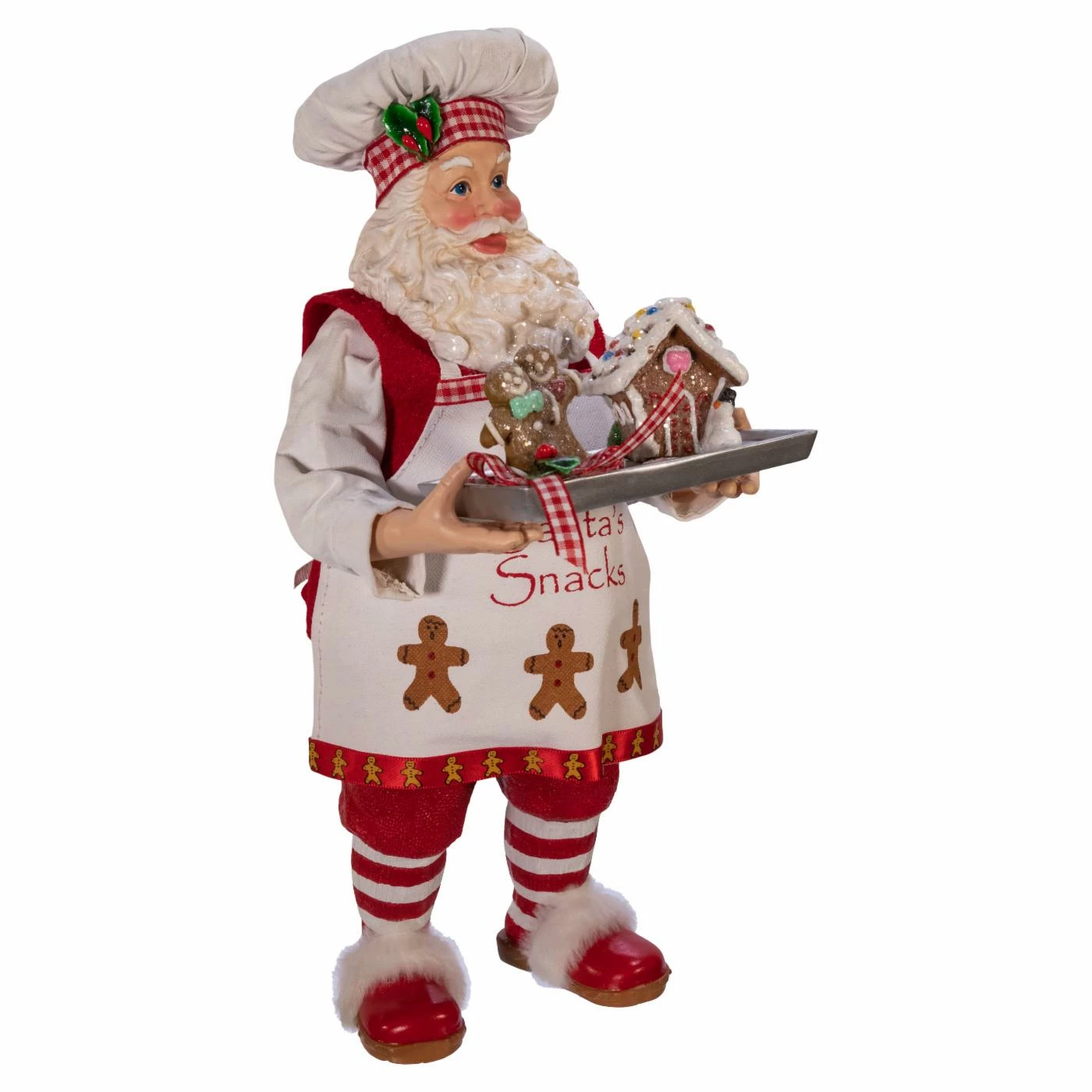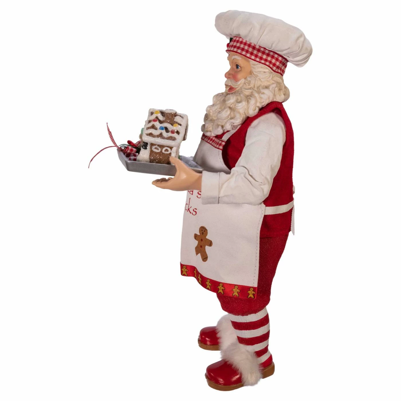 The Kurt Adler 11 in. Fabriche Gingerbread Chef Santa provides your kitchen, dining room, or living room with a fresh-from-the-oven accent that makes your holidays even better. This Santa delivers a tray of frosted gingerbread men and a gingerbread house, not presents. The figure comes crafted from PVC and polyester with fabric clothes and apron. Heβs even wearing a chefβs hat instead of his usual headgear, making this piece perfect for your favorite holiday bakerβs home.