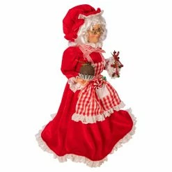 Enhance your cozy holiday dΓ©cor with the Kurt Adler 16.5 in. Kringle Klaus Mrs. Claus with Apron. Mrs. Clause wears a red dress with white trim that matches her hat. A red and white checked apron holds peppermint candies. In one hand, she holds a cheery Christmas wreath, and in the other, she proudly displays her baked goods.