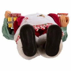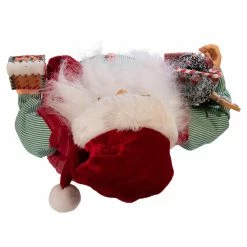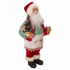 The Kurt Adler 18 in. Kringle Klaus Santa and Gingerbread House gives Santa a chance to show off his baking skills. Here, Santa wears his traditional red outfit with white trim and black boots. However, he also wears an apron. He carries a gingerbread house in one hand, and a small Christmas tree. Gingerbread cookies and peppermint candy sticks sit in his apron pocket, making this Santa a great addition to your kitchen or dining room holiday dΓ©cor.