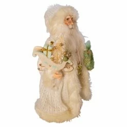 Create your own winter wonderland with the Kurt Adler 18 in. Kringle Klaus Winter White Santa. Santa wears a long white coat with a cable knit pattern and white fur lining. His frilly button-up shirt features gold buttons. He carries a green wreath in one hand, and a small white sled and gold Christmas tree in the other. Pair this Santa with other white and gold holiday dΓ©cor pieces for a soft, monochromatic look, or use the figurine to offset a colorful holiday theme.