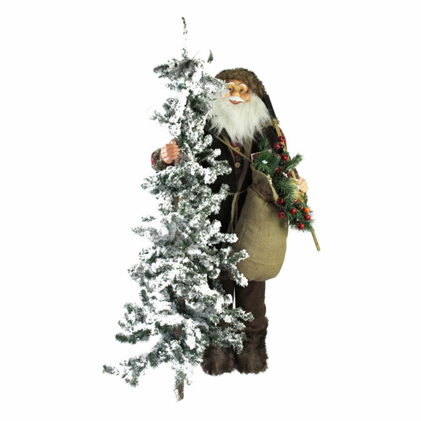 Bring a little woodland charm to your holiday decorative display with the Northlight 4 ft. Standing Woodland Santa Claus. This adorable Santa stands tall, holding a flocked Christmas tree. He carries a burlap bag with pine accents for a charming and rustic touch.