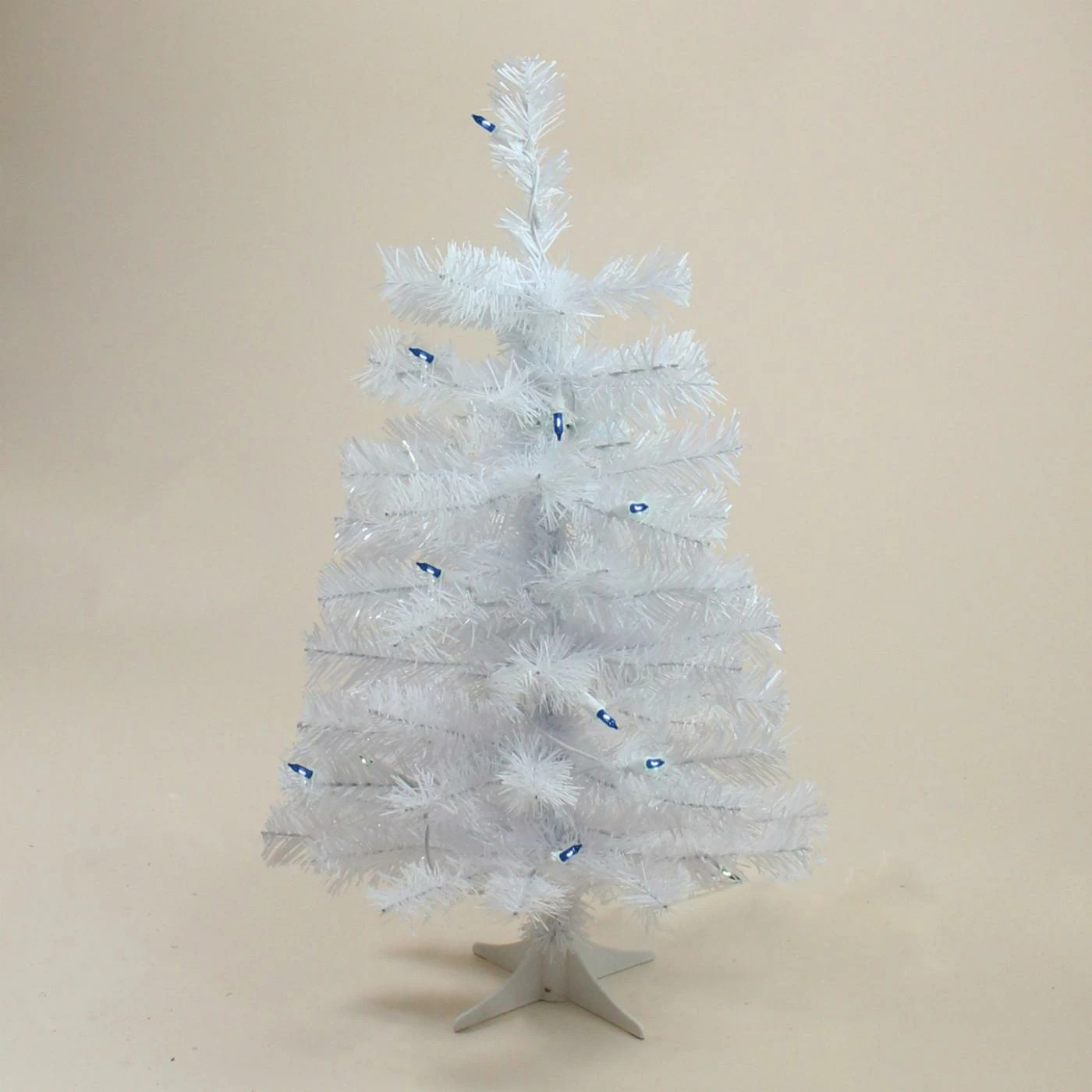 The Northlight 2 ft. Pre Lit Flat-Round Tip Wrapped Artificial Tabletop Christmas Tree lets you decorate for the holidays in contemporary style. Its snow white branches are accented with colorful lights for a guest-wowing effect.